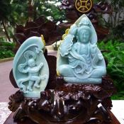 老坑浅绿飘黄翡 翡翠A货 童子拜观音菩萨摆件