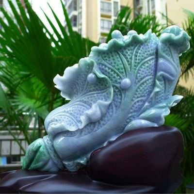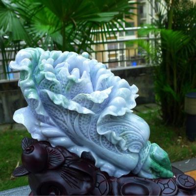 这件翡翠白菜摆件为春带彩翡翠摆件。如此大