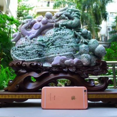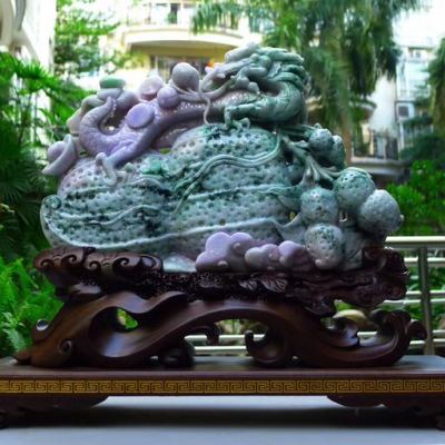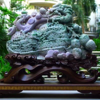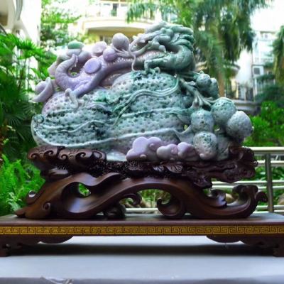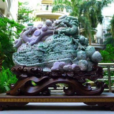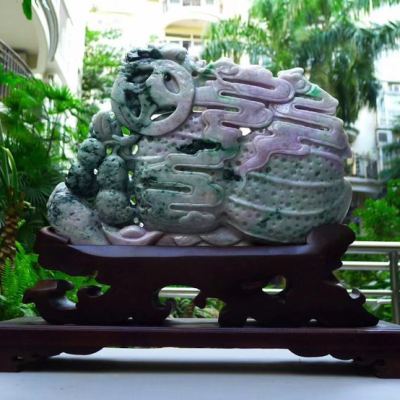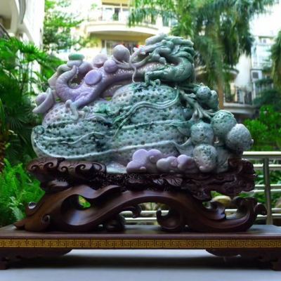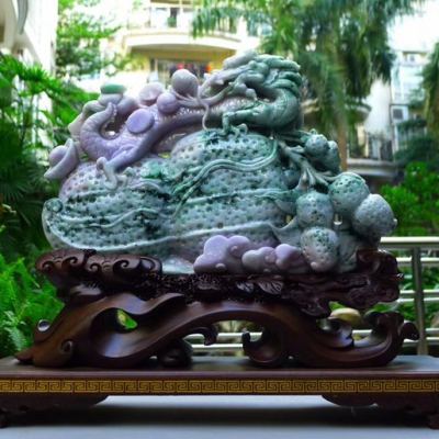 翡翠A货 糯种春带彩 龙腾盛世大花生龙摆件