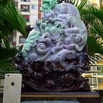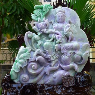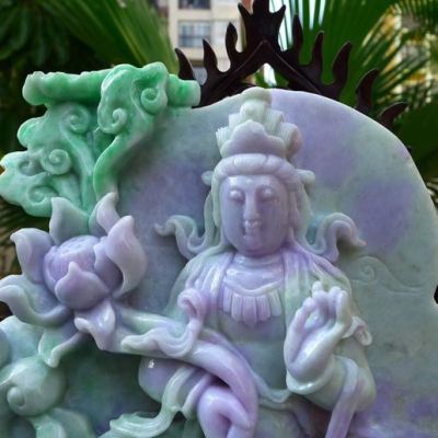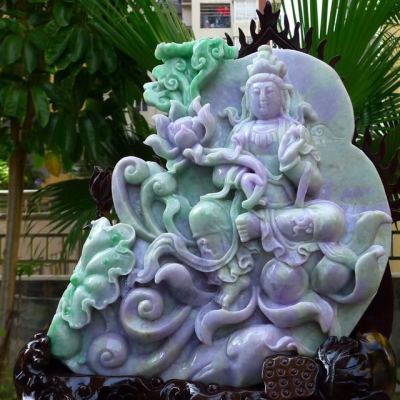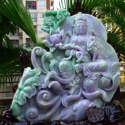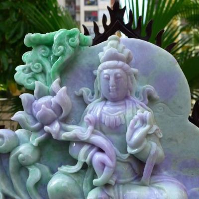 翡翠A货 糯种春带彩 莲花观音翡翠摆件