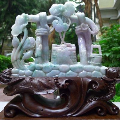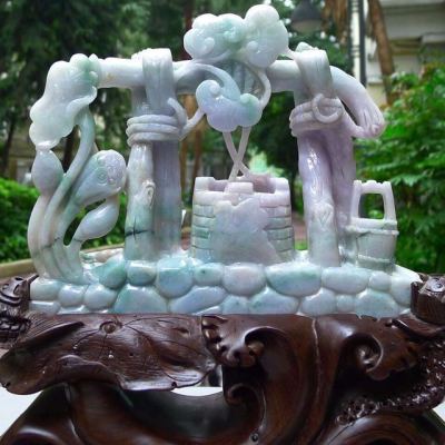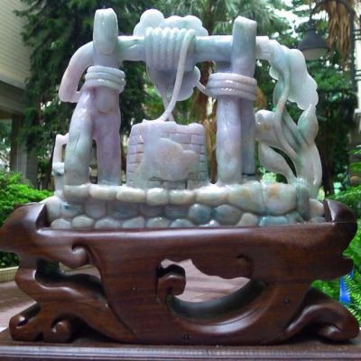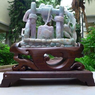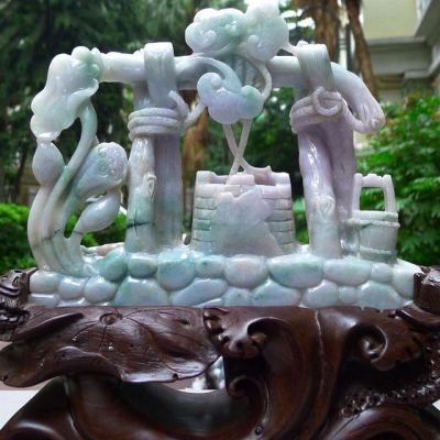 翡翠A货 老坑糯种春彩 饮水思源水井翡翠摆件