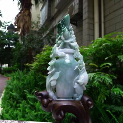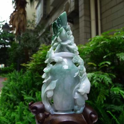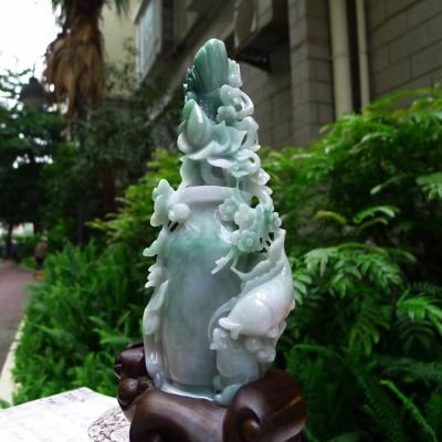 老坑水润飘绿 翡翠A货 年年有鱼花瓶摆件