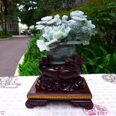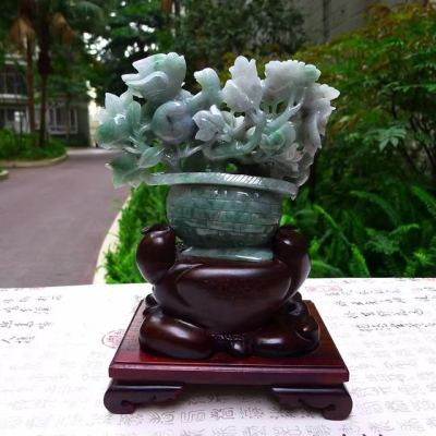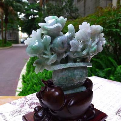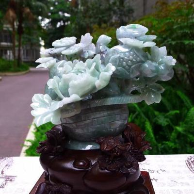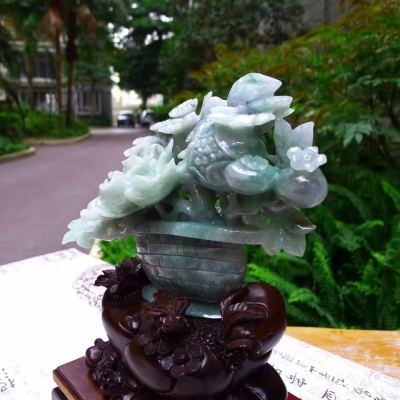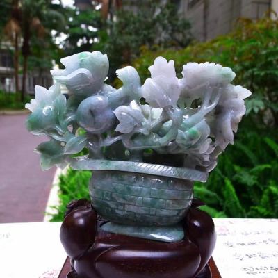 翡翠A货 老坑糯冰春彩 富贵满篮花篮摆件