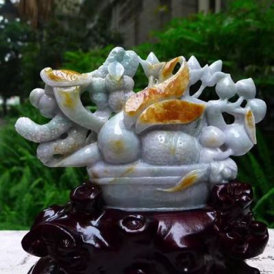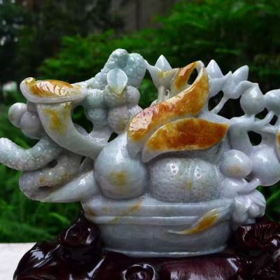 老坑春彩飘黄翡 翡翠A货 富贵一生果篮摆件