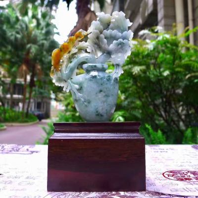 翡翠A货 老坑水润飘花飘黄翡 牡丹花瓶摆件