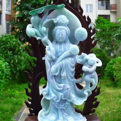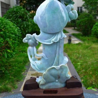 糯冰春彩飘花 翡翠A货 送子观音莲花观音摆件