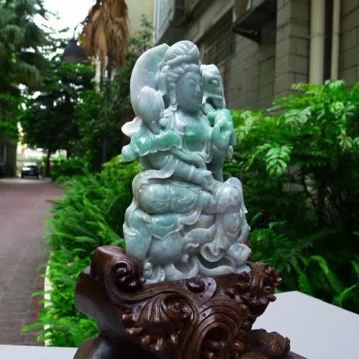 翡翠A货 老坑紫底飘阳绿 观世音菩萨摆件