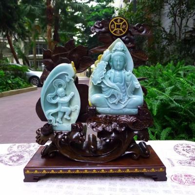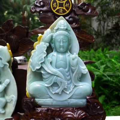 老坑浅绿飘黄翡 翡翠A货 童子拜观音菩萨摆件
