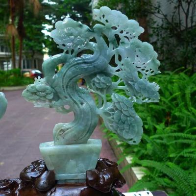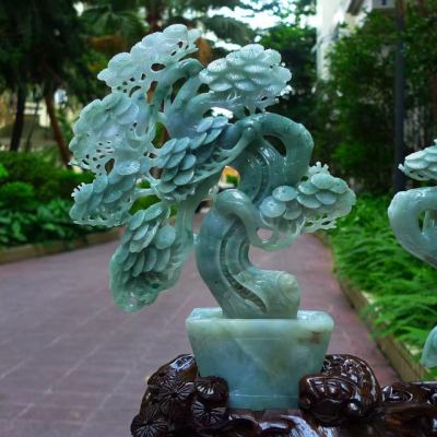 翡翠A货 老坑水润满绿 细雕迎客松摆件