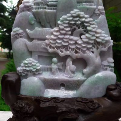 翡翠A货 老坑糯冰浅春彩 松下问童子山水意境摆件