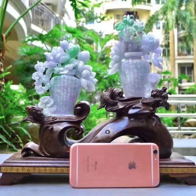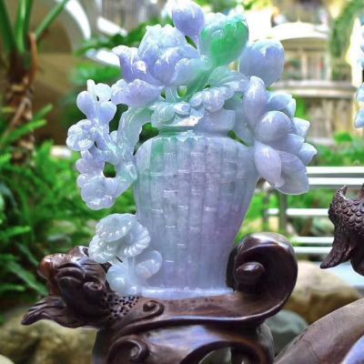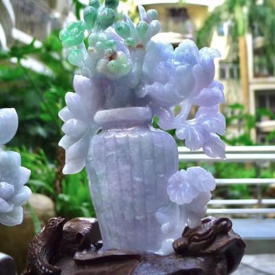 翡翠A货 老坑浅紫飘阳绿 花开富贵平平安安花瓶摆件