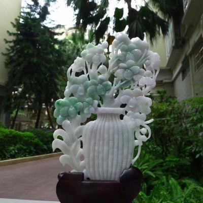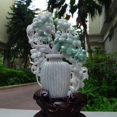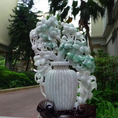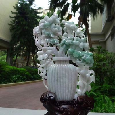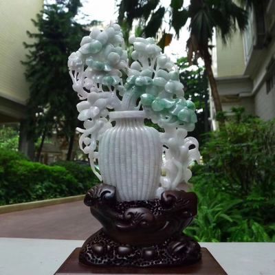 老坑糯冰春彩飘绿 翡翠A货 花开富贵花瓶摆件