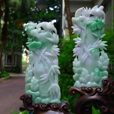 翡翠A货 老坑冰透春彩飘绿 节节高升富贵竹摆件