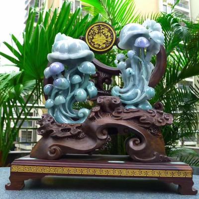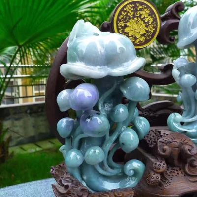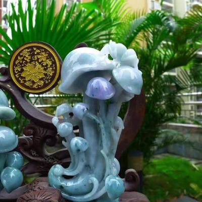 天然翡翠A货 精美飘花带紫 富甲天下香菇摆件