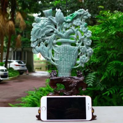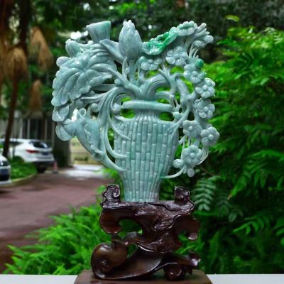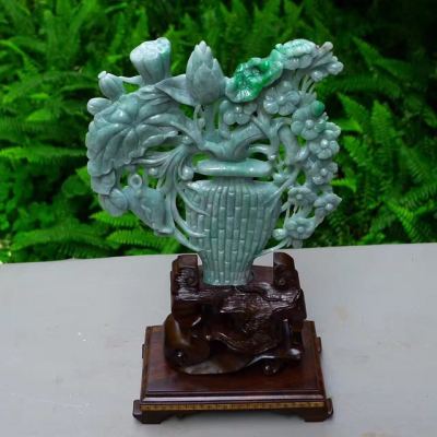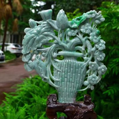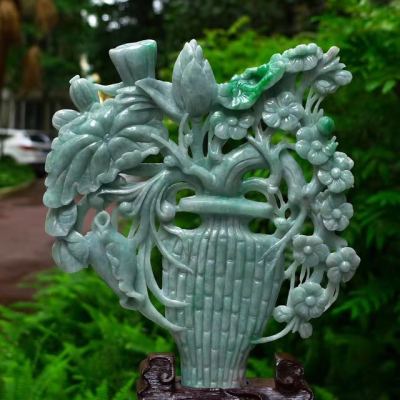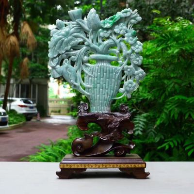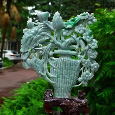 老坑满绿翡翠A货 平平安安花开富贵花瓶摆件