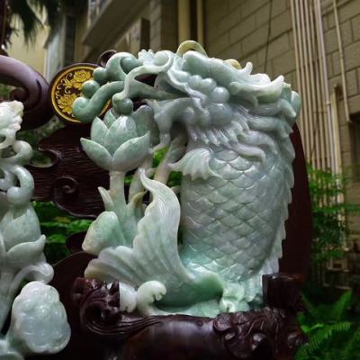 翡翠A货 老坑水润浅绿 年年有鱼龙头鱼摆件