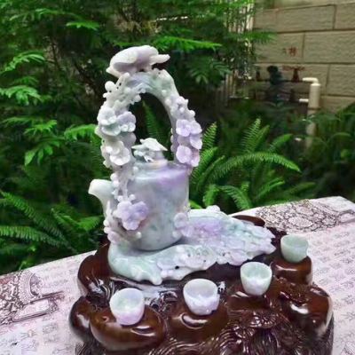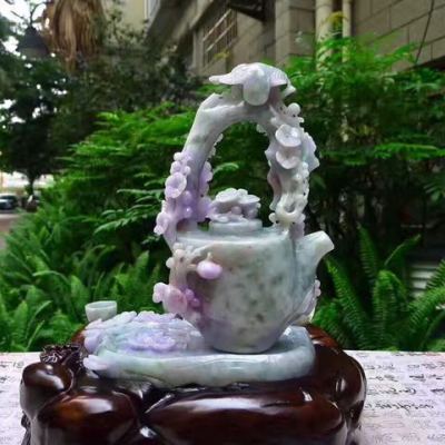翡翠A货 老坑水润春带彩 梅花茶壶一套摆件