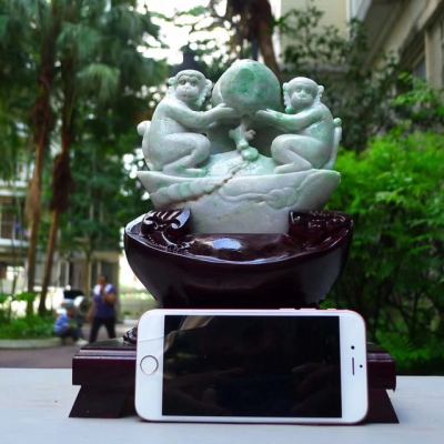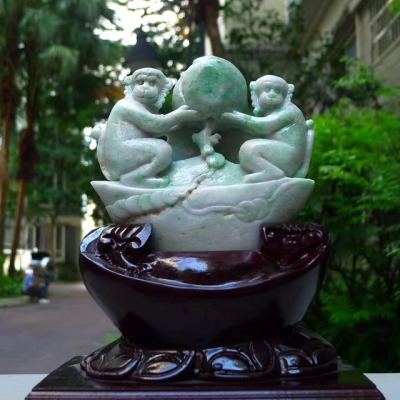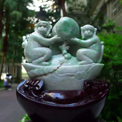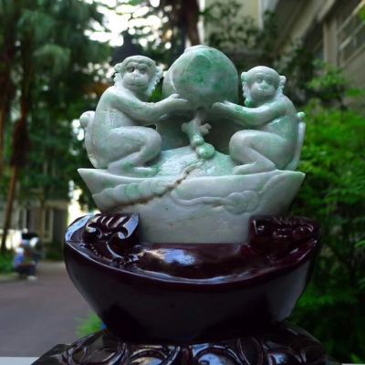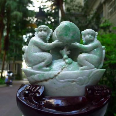翡翠A货 老坑水润飘绿 金猴献寿寿比南山摆件