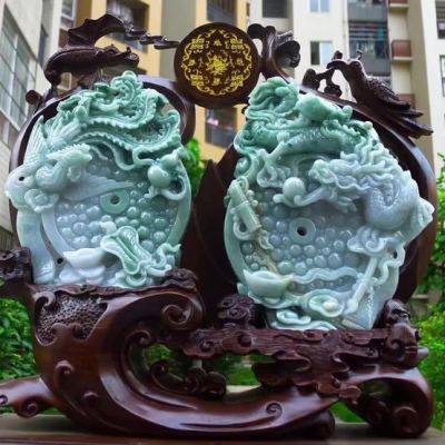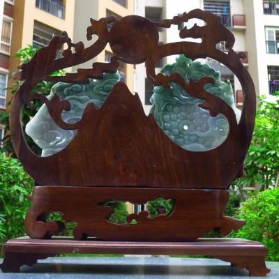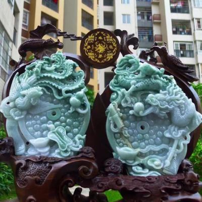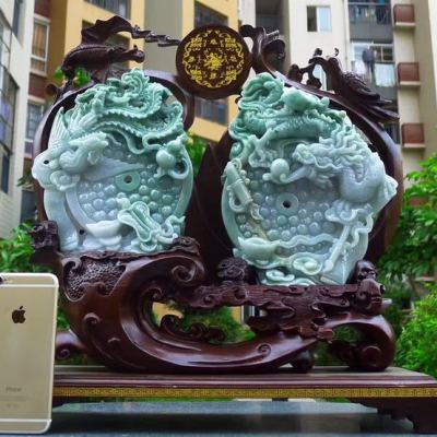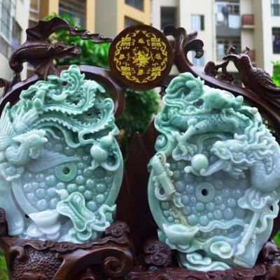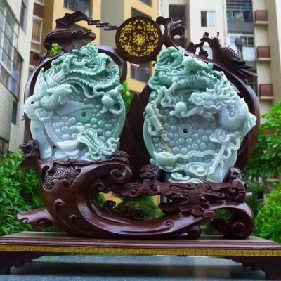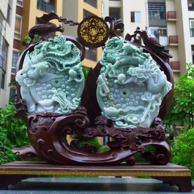 冰糯飘花 天然翡翠A货 龙凤呈祥富贵吉祥摆件