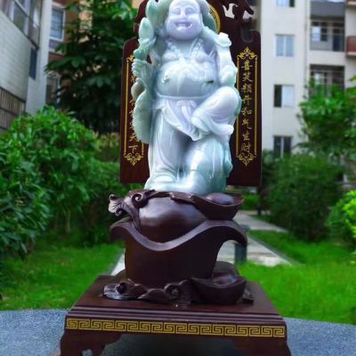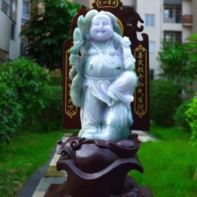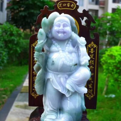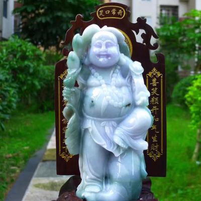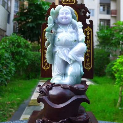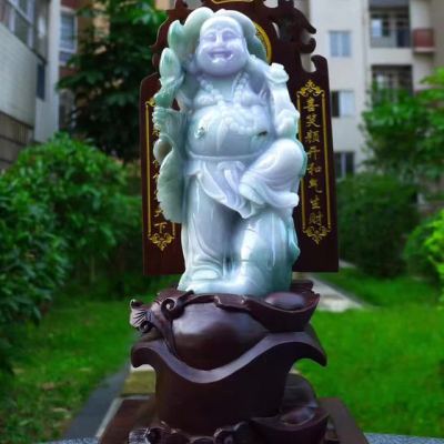 天然翡翠A货 糯冰春彩水润飘绿 福寿双全笑佛摆件