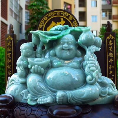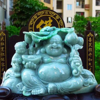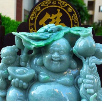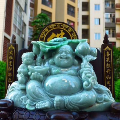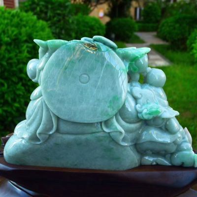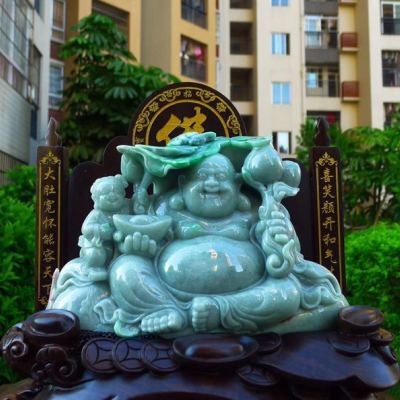 翡翠A货 精美飘花满绿 大件饱满笑佛摆件