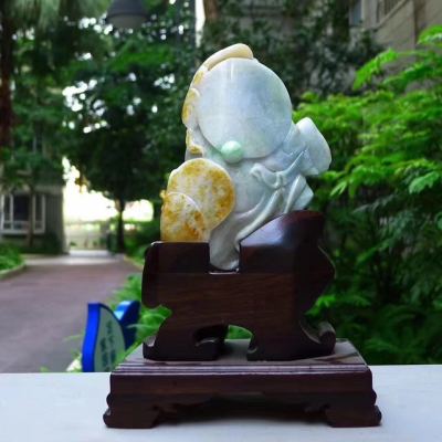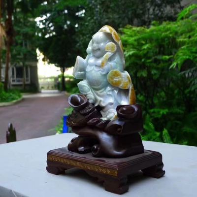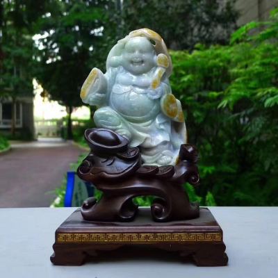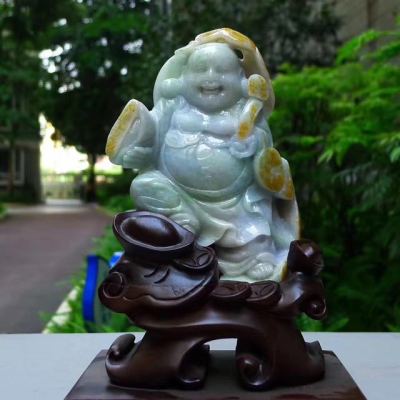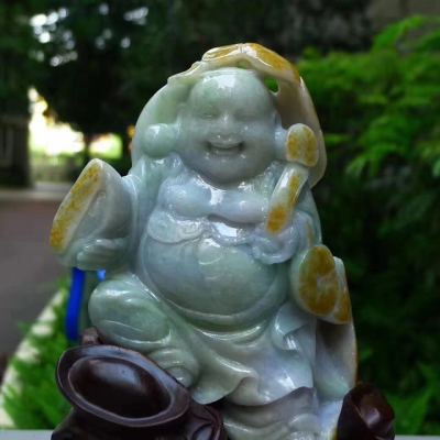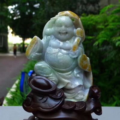 翡翠A货 老坑春彩飘黄翡 招财进宝佛公摆件