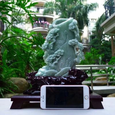 翡翠A货 老坑水润满绿 万年松笔筒摆件