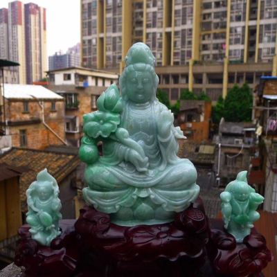 精雕飘绿翡翠 童子拜观音菩萨摆件