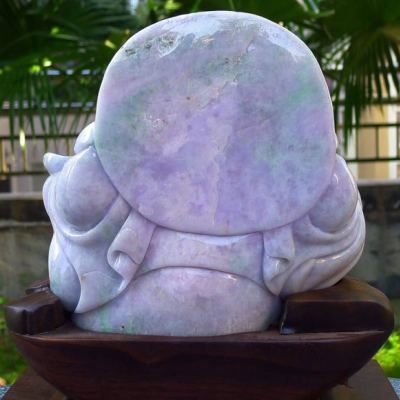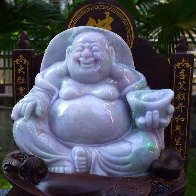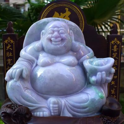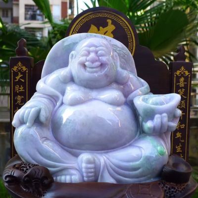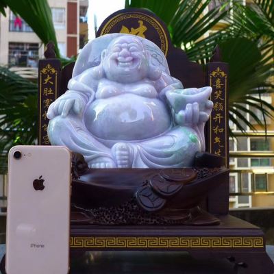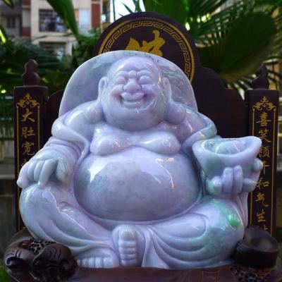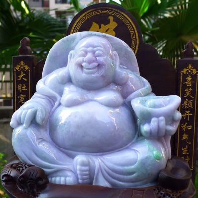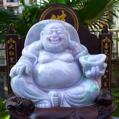 翡翠A货 精美春带彩 大件笑佛翡翠摆件