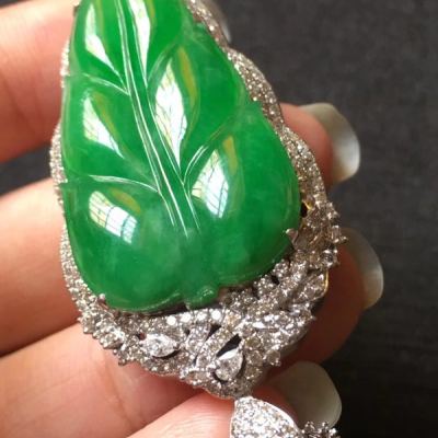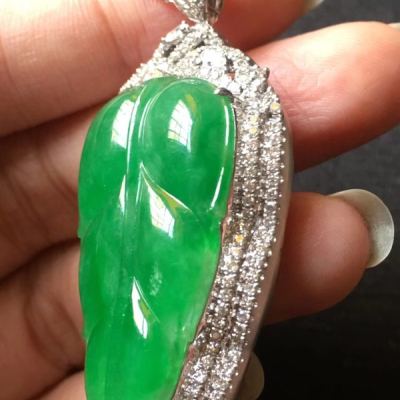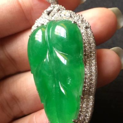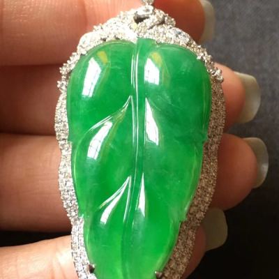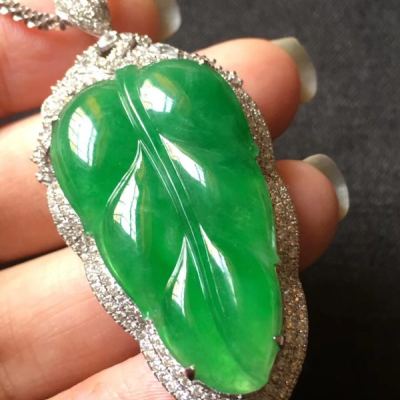 冰种正阳绿大绿叶 翡翠挂件 裸石35.5:19.5:6mm