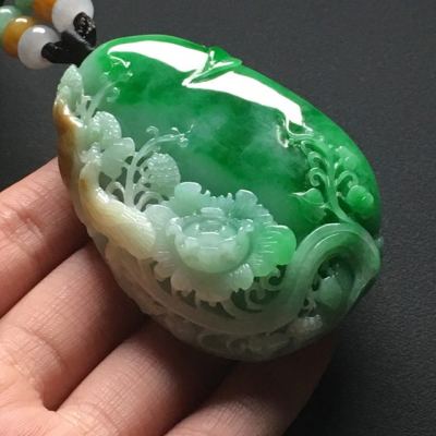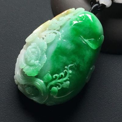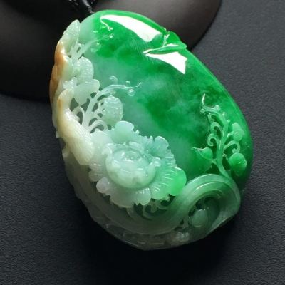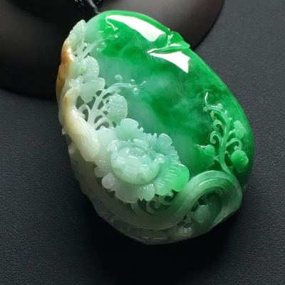 巧雕黄加绿鸟语花香 翡翠吊坠 尺寸:56-40-16毫米