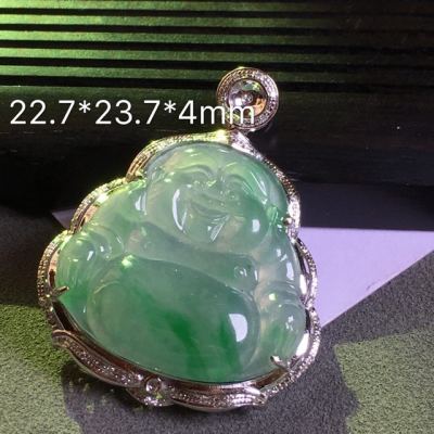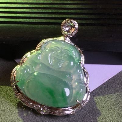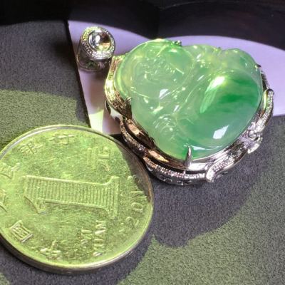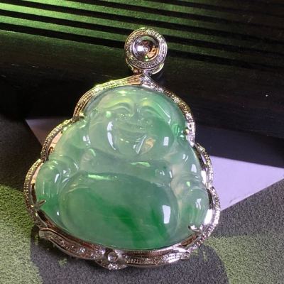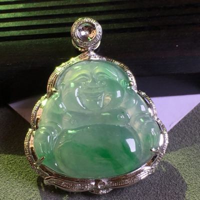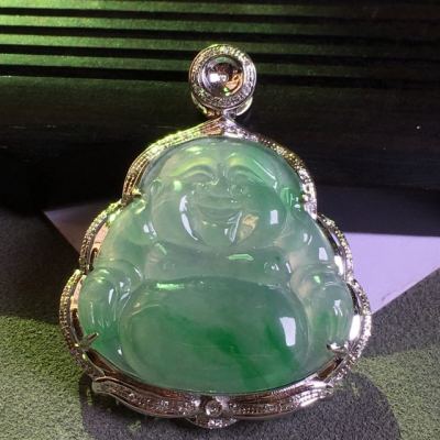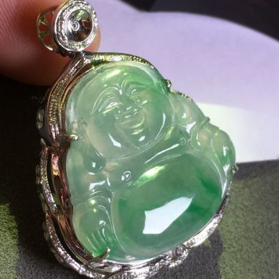 冰种飘绿佛公 翡翠吊坠 冰透起光 色泽鲜艳