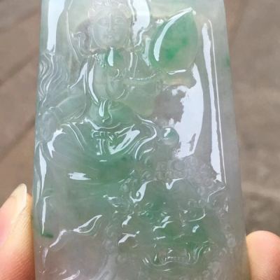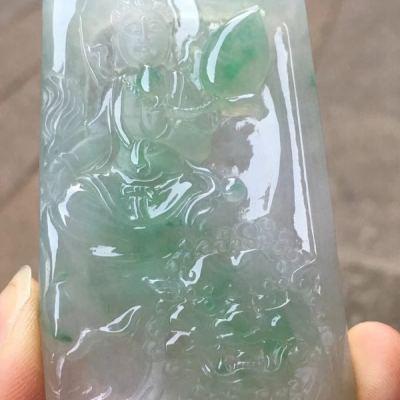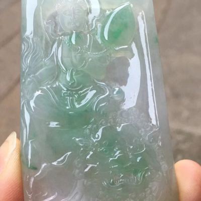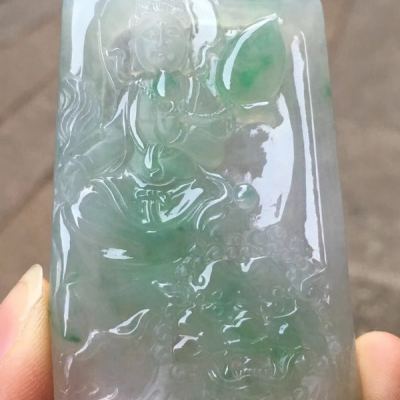 老坑料冰种俏阳绿文殊菩萨 翡翠吊坠 冰透起光