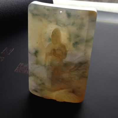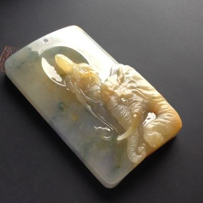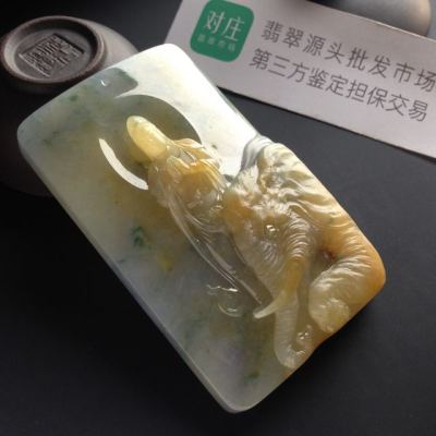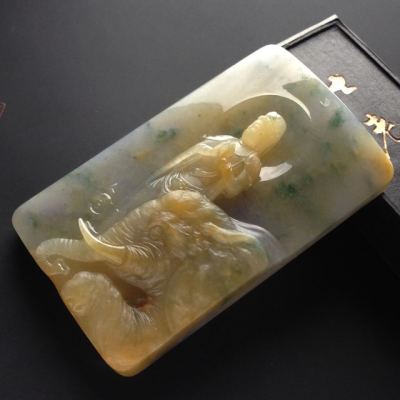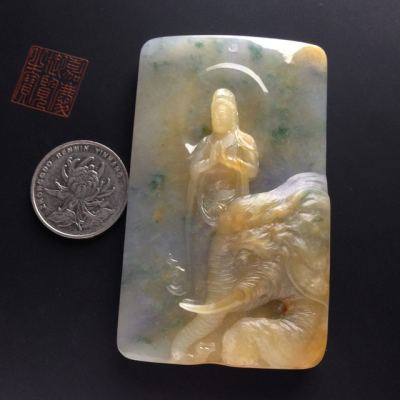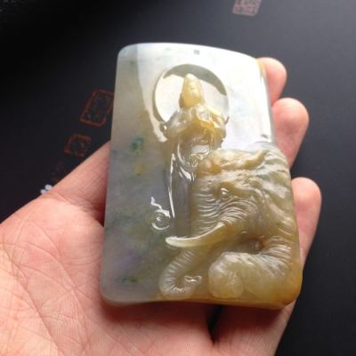 糯冰种黄翡飘花普贤菩萨 翡翠吊坠 尺寸77-46-13毫米