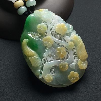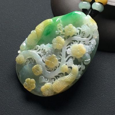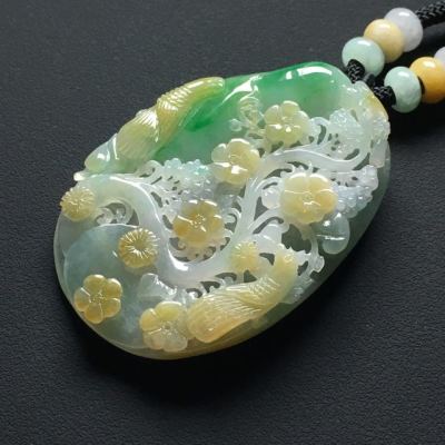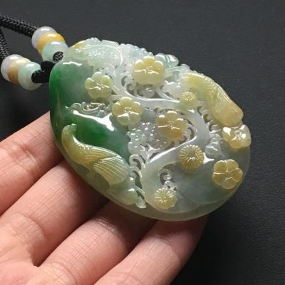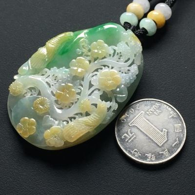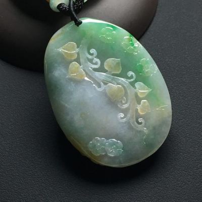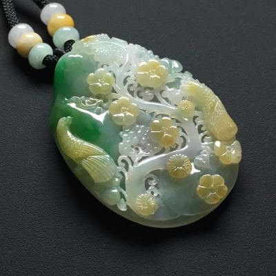 巧雕黄加绿花开富贵 翡翠吊坠 尺寸:55-40-11.8毫米