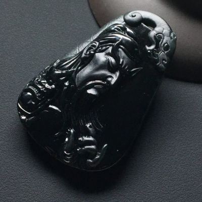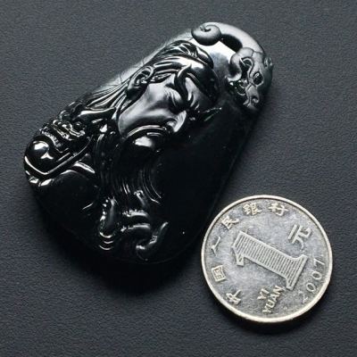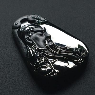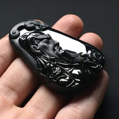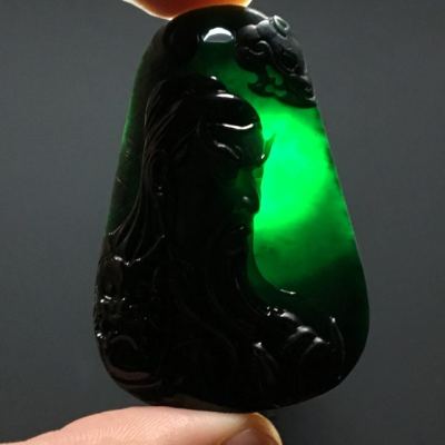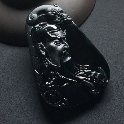 冰种墨翠忠义关公 翡翠吊坠 尺寸:55.7-37.6-8.5毫米