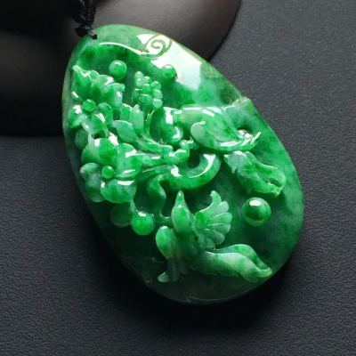 巧雕阳绿鸟语花香 翡翠吊坠 尺寸:55-35-10.8毫米