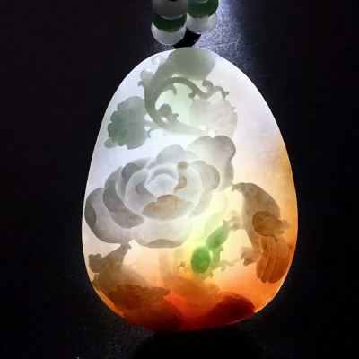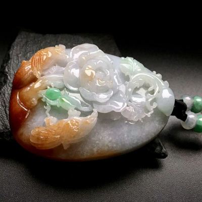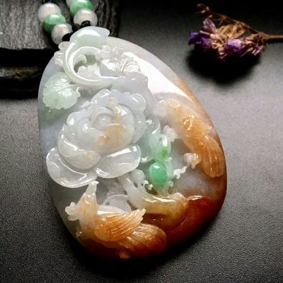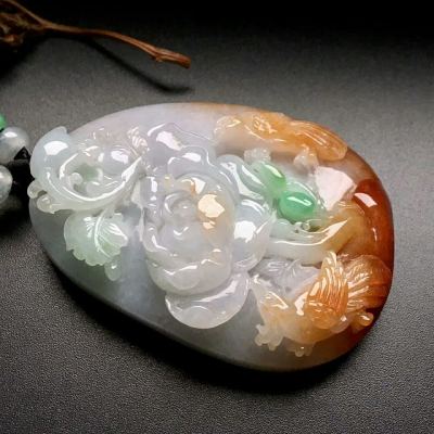 三彩花香鸟语 翡翠吊坠 尺寸: 61-46-16mm