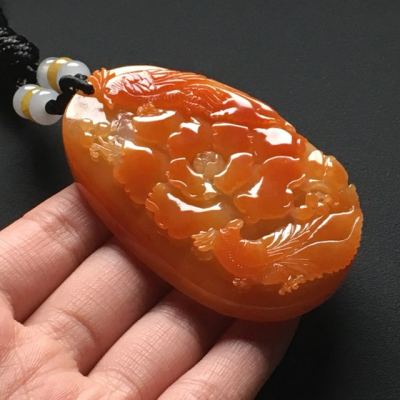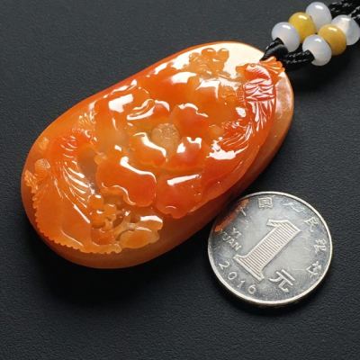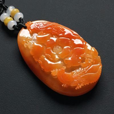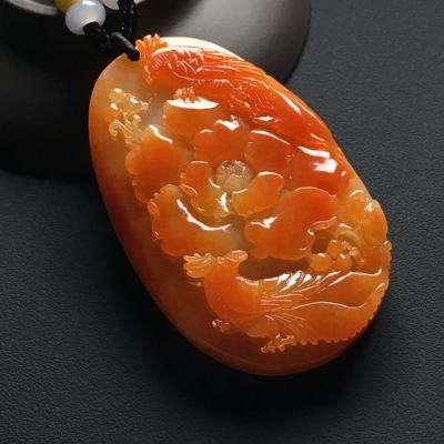 巧雕红翡鸟语花香 翡翠吊坠 尺寸:62-38-10.9毫米