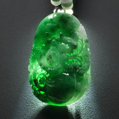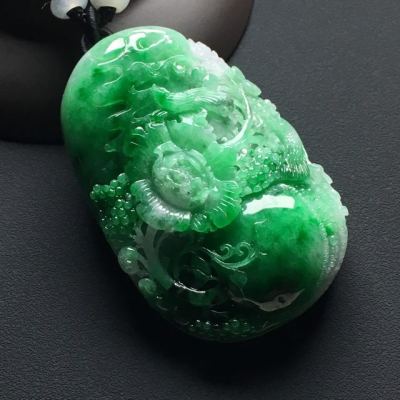 巧雕阳绿鸟语花香 翡翠吊坠 尺寸:62-40-15.6毫米