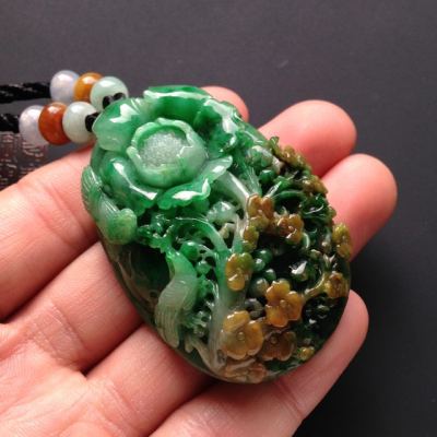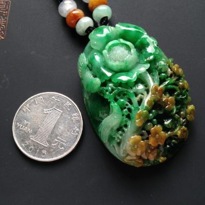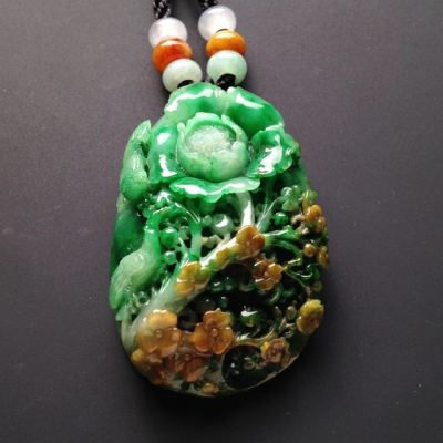 巧雕黄加绿花鸟翡翠吊坠 尺寸51-35-14毫米