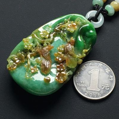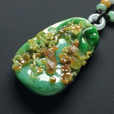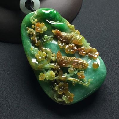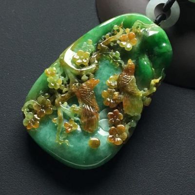 巧雕黄加绿鸟语花香翡翠吊坠 尺寸:58-37-14毫米