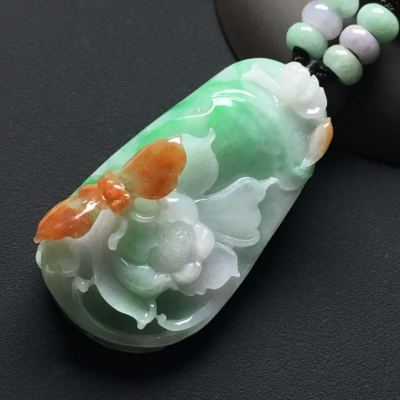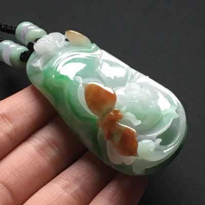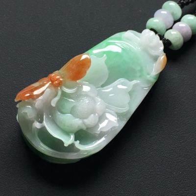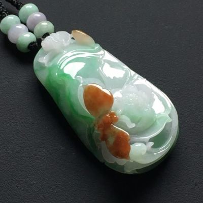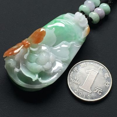 冰种飘绿 巧雕三彩蝶恋花翡翠吊坠 尺寸:56-30-18毫米