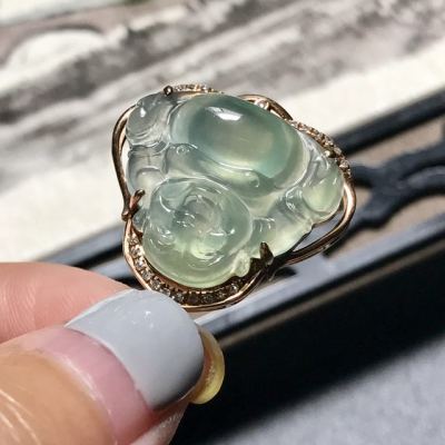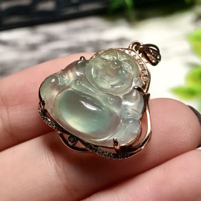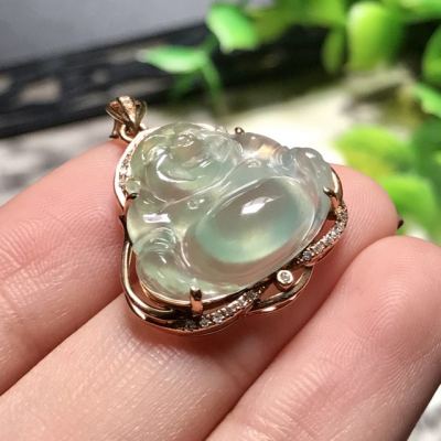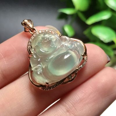 冰种晴水佛公 佛翡翠吊坠 18K金伴钻镶嵌 裸石尺寸:16.5*18.8*5.3mm