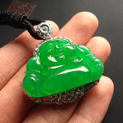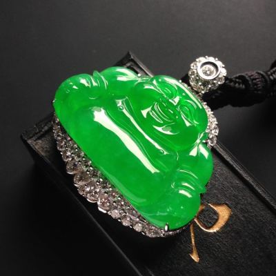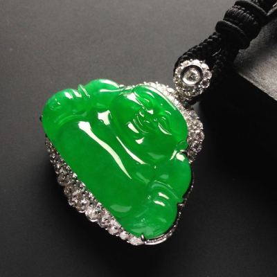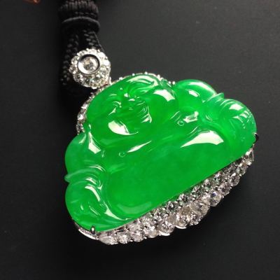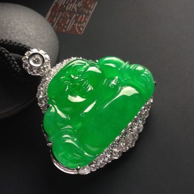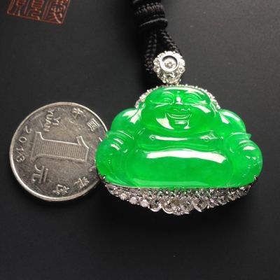 老坑冰种满色帝王绿笑佛 佛翡翠吊坠 18K金镶嵌 尺寸23-36-3.5毫米 连金尺寸39-36-11毫米