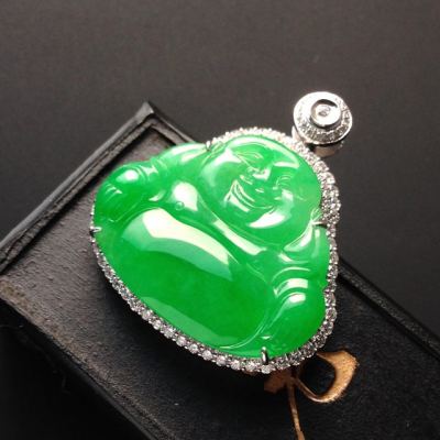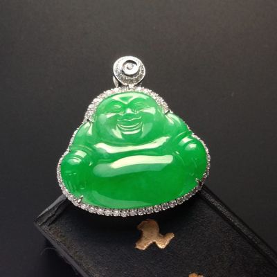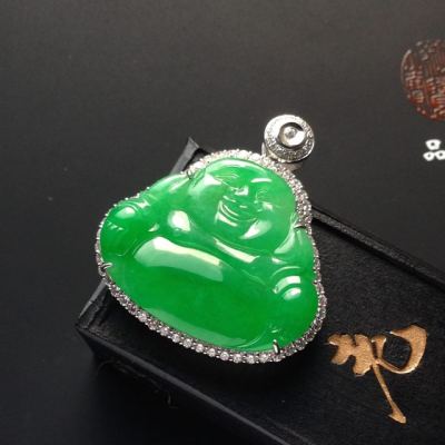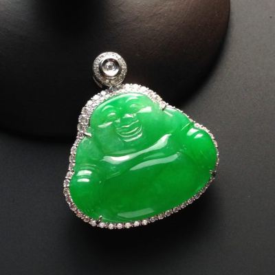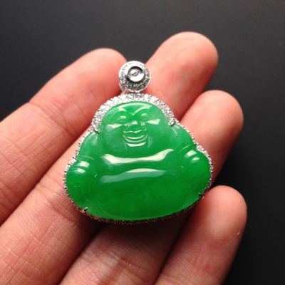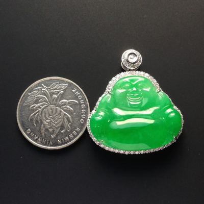 冰种满色阳绿佛公翡翠吊坠 18K白金配真钻镶嵌 裸石24-27-2.5毫米 连金33-31-9毫米