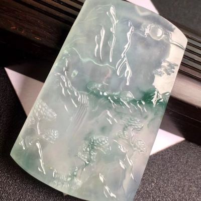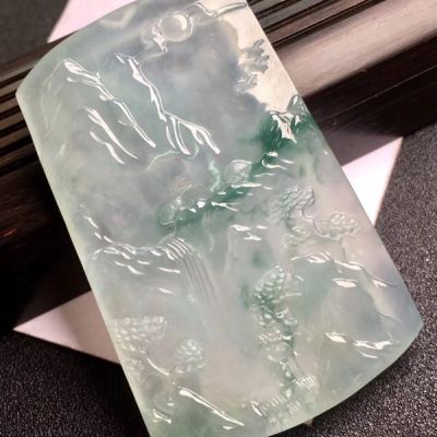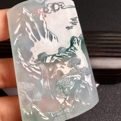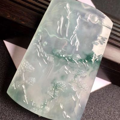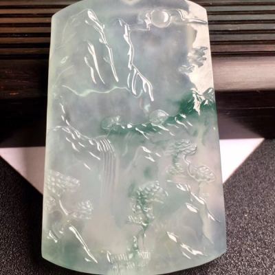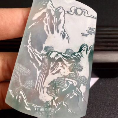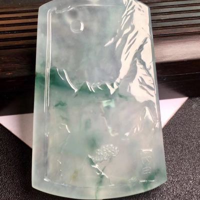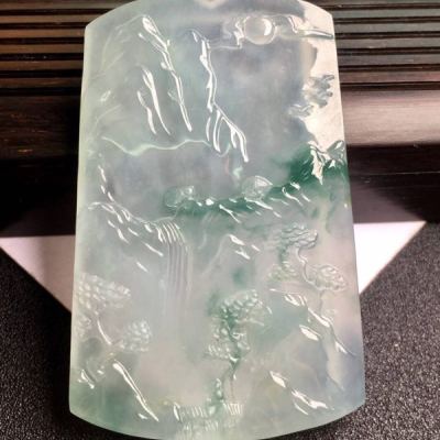 冰种飘绿山水牌翡翠吊坠 尺寸:64*42*6
