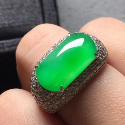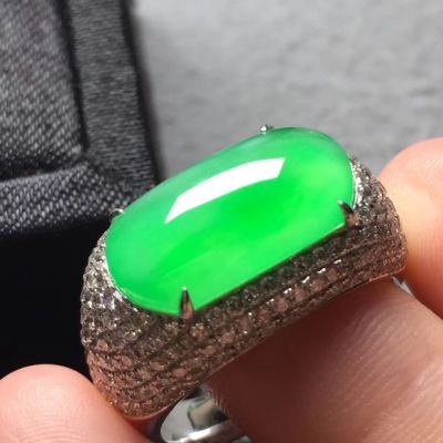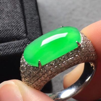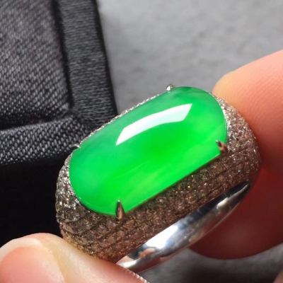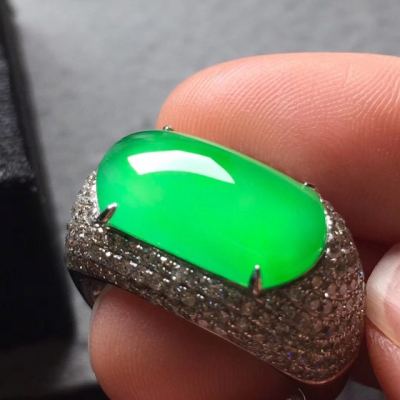 翡翠被切割成蛋面,镶嵌在戒指上,华丽