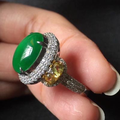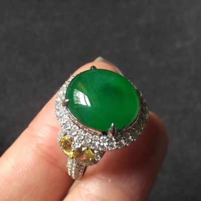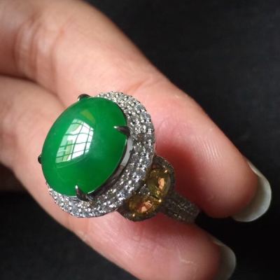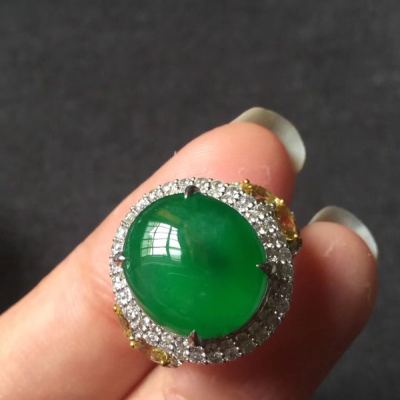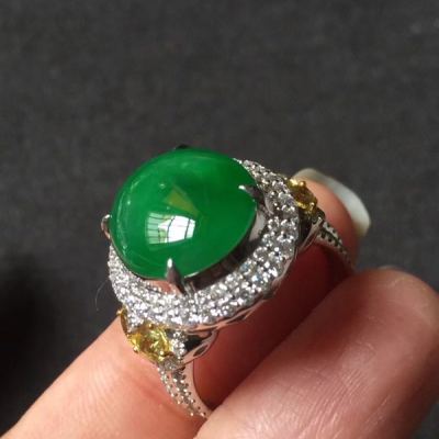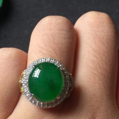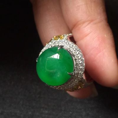 翡翠被切割成蛋面,镶嵌在戒指上,华丽