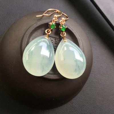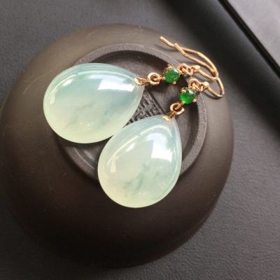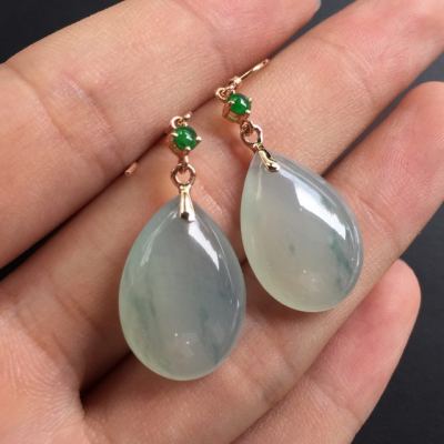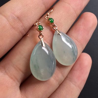 冰种晴水飘花 翡翠耳坠 18k金镶嵌